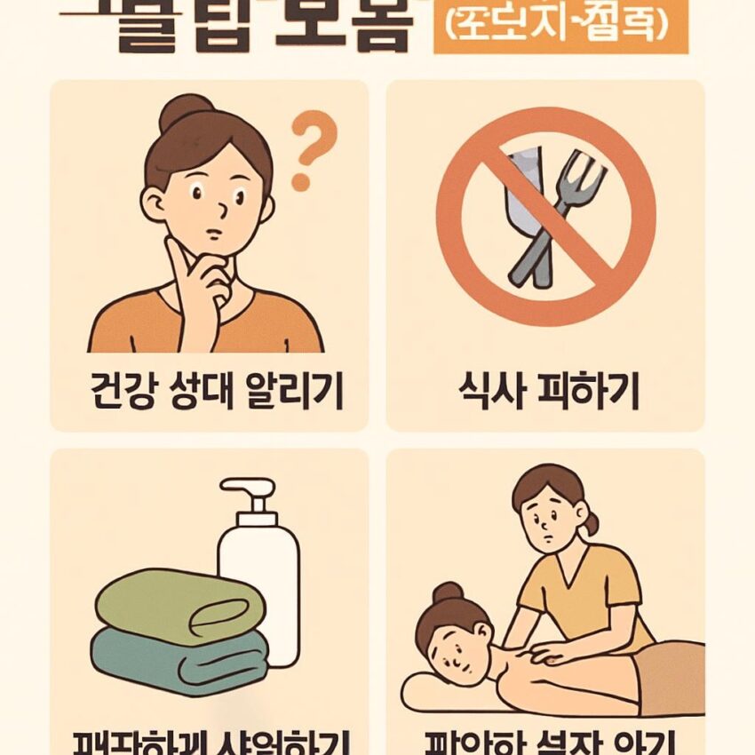 처음 마사지를 받으려고 하면 기대만큼이나 걱정도 생기기 마련입니다. 어떤 준비를 해야 하는지, 불편한 점은 어떻게 말해야 하는지 몰라 어색함을 느끼는 분들도 많습니다. 하지만 몇 가지 기본적인 사항만 알고 있어도 마사지 만족도는 크게 달라집니다. 오늘은 마사지 초보자라면 꼭 알아두면 좋은 꿀팁을 정리해 드리겠습니다. 마사지 목적을 분명히 하세요 마사지를 받기 전 가장 먼저 해야 할 일은 목적을…